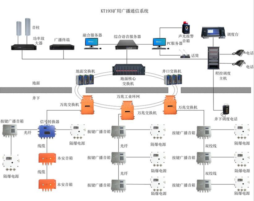 煤礦通訊發(fā)展方向是在井下建立工業(yè)環(huán)網(wǎng),各種自動(dòng)化系統(tǒng)通訊傳輸采用工業(yè)環(huán)網(wǎng)傳輸方式。本煤礦安全應(yīng)急對(duì)講廣播系統(tǒng)可以在不額外敷設(shè)線主干線纜的情況下,就近實(shí)現(xiàn)接入,而且可以根據(jù)不同的工作地點(diǎn),劃分主音箱網(wǎng)絡(luò),還可以實(shí)現(xiàn)全礦廣播網(wǎng)絡(luò),因此,本方案按照網(wǎng)絡(luò)傳輸方式進(jìn)行設(shè)計(jì)。以下是產(chǎn)品的系統(tǒng)拓?fù)鋱D: